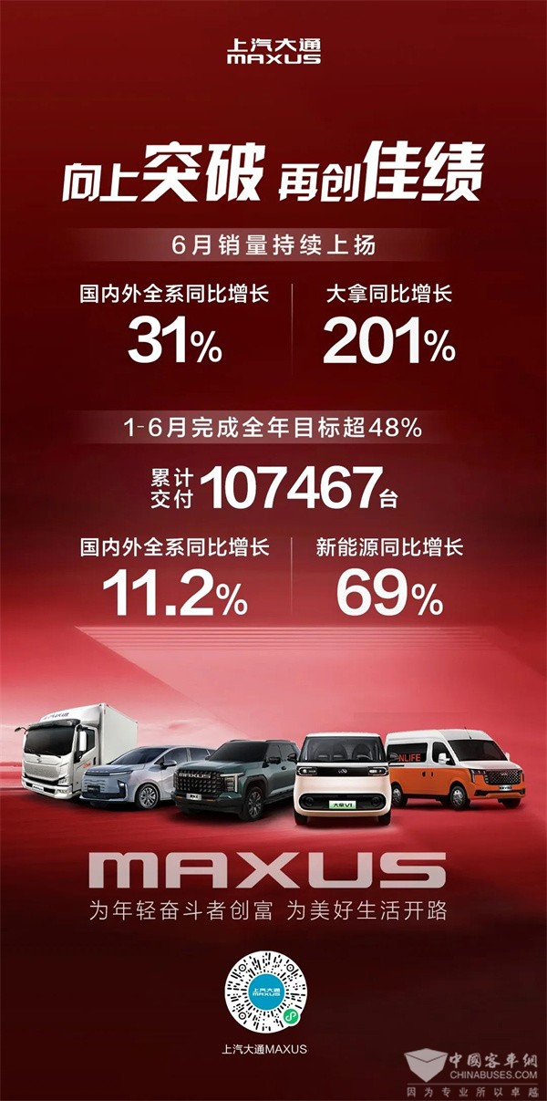 上半年,上汽商用车发布全新战略,构建用户价值新生态,引领商用车行业转型升级。亮点纷呈的年中答卷,正是战略转型成效的最好验证。未来,上汽大通将继续以用户需求为导向,推动产品创新和服务升级,为商用车市场贡献更多“大通方案"。