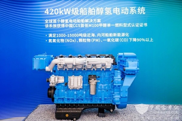 航运业碳排放约占全球总排放量的 3%,尽管碳减排进程不断提速,但仍面临巨大挑战。远程打造的醇氢电动系统船舶解决方案,拥有绿色、高效、节能、无里程焦虑等优势,并获得中国船级社首张M100单燃料船用发动机型式认可证书,成为新能源船舶最佳解决方案。本次展出的远程420kW级船舶醇氢电动系统覆盖1000-15000级船型,相比纯电动续航更长、购置更低,并可享受政策补贴,是实现近海、江河、湖泊的船用驱动电动化的中国特色解决方案。
