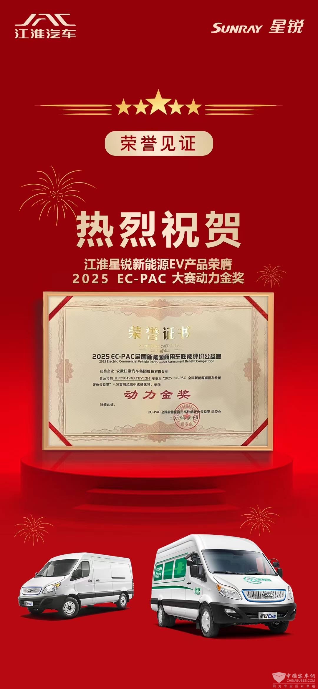 XINGKONG.COM 2025 年 7 月 17 日讯,近日,备受行业瞩目的 2025EC-PAC 全国新能源商用车性能评价公益大赛在招商局检测车辆技术研究院有限公司圆满落幕。在这场汇聚全国 18 家主流车企、22 款重磅车型的巅峰对决中,江淮汽车旗下星锐新能源 EV 系列凭借硬核产品力脱颖而出,成功摘得 “动力金奖”,用实力诠释中国新能源商用车的技术高度。