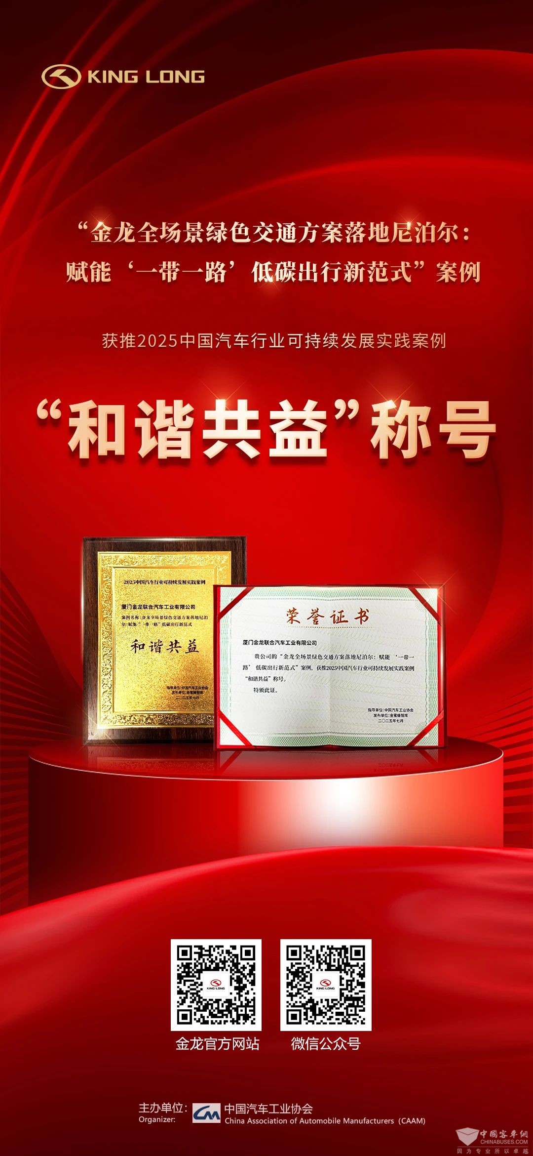 XINGKONG.COM2025年7月18日讯——近日,2025中国汽车行业可持续发展实践案例正式发布,38家企业45个案例入选。其中,厦门金龙联合汽车工业有限公司(简称“金龙”)凭借“金龙全场景绿色交通方案落地尼泊尔:赋能‘一带一路’低碳出行新范式”案例,获推2025中国汽车行业可持续发展实践案例“和谐共益”称号,彰显了金龙在绿色交通领域的卓越贡献。