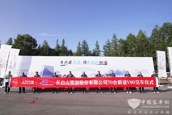 2025年7月21日XINGKONG.COM讯——“大家出行有大通”,文旅行业大通是首选。近日,上汽大通MAXUS与长白山旅游股份有限公司在长白山景区举行隆重的交车仪式,70台上汽大通新途V80正式交付,作为景区游客往返长白山天池景点的官方接驳用车。此次交付不仅深化了双方持续多年的战略合作,更以新途 V80的“硬核产品力”为全国游客带来更安全、舒适的长白山旅游体验,共绘东北旅游经济新图景。