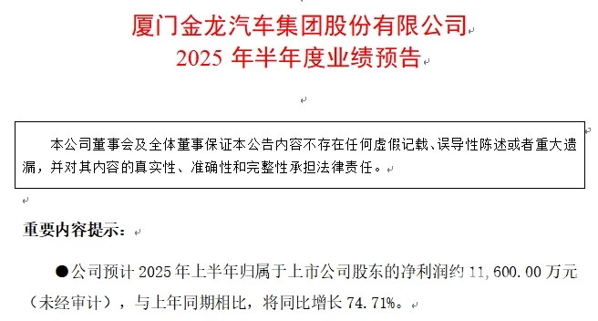 2025年7月15日,金龙汽车(600686.SH)对外发布2025年半年度业绩预告。据公告显示,经财务部门初步测算,预计金龙汽车2025年上半年实现归属于上市公司股东的净利润约11,600.00万元(未经审计),与上年同期6,639.61万元相比,将同比增长74.71%。