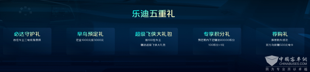 福田卡文乐迪售价9.98万元起,可根据需要选择智能化配置,首批下定用户将享受五重大礼:必达守护礼,首任车主三电终身质保;早鸟预订礼,定金1000元抵3000元;超级飞侠大礼包,前100位车主,赠送超级飞侠大礼包;专享积分礼,预订期内下订赠送80000积分;荐购礼,推荐购车成功,双方均获赠500元电卡。