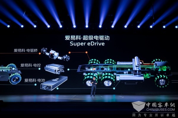 此次发布的爱易科超级电驱动,集超级安全、超级节能、超级智能于一体,全面匹配重卡、客车2类平台产品,可电可氢、涵盖电控、电驱桥、电池三大系统,以全技术领跑、全场景产品矩阵、生态服务创新引领新能源商用车新标准。