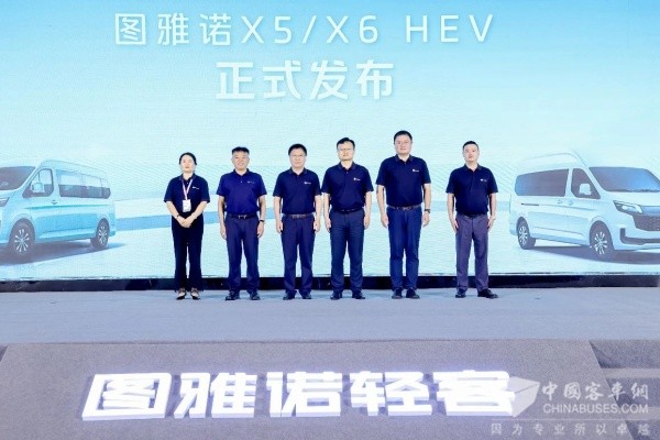 会议期间,图雅诺X5/X6 HEV新品正式发布。该产品凝聚前沿技术与创新理念,以创新架构、油电混动、智能切换、功能升级为支点,一并攻克油耗、动力、续航、环保等难题,实现从运输工具到全能伙伴的全方位升级,覆盖多能兼用、商旅客运、改装定制多场景,为用户提供“平、安、多、省”的用车体验。