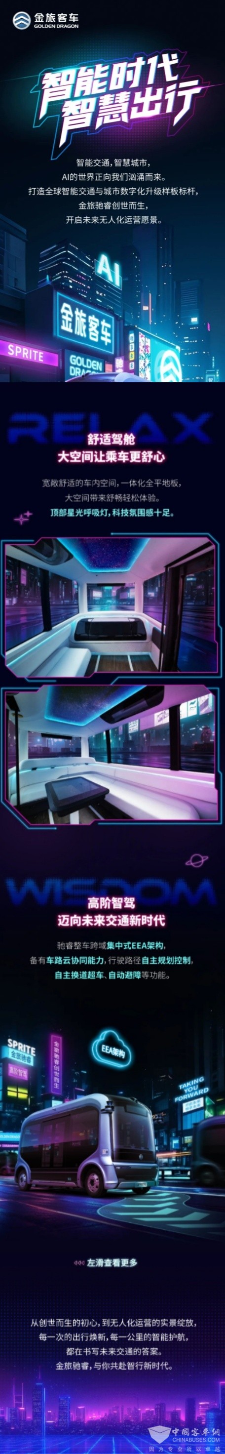 金旅睿驰客车外观圆润流畅,透光面积大16.6平方米,视野通透,车内空间宽敞,科技感十足,配备集中式EEA架构和车路云协同能力,实现自主换道超车。