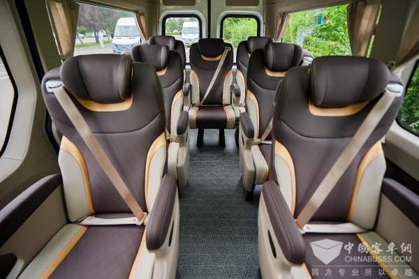 为打造舒享驾乘体验,宇通严选品材,打造环保内饰,这一点在此次高温实测中已得到充分印证。搭配PET降噪材料与NVH超级静音技术,天骏V6E高速行驶噪声低于65dB,静谧性媲美乘用车。空间设计兼顾实用与舒适,车内高度1890mm,可配备独立商务座椅或人机工程学座椅,搭配手动滑移门与电动踏步,实现“下车不拥挤、车内不碰头”。再加上可选装的12.8寸中控屏,支持语音交互与手机多模式投屏,让旅途秒变移动娱乐空间。