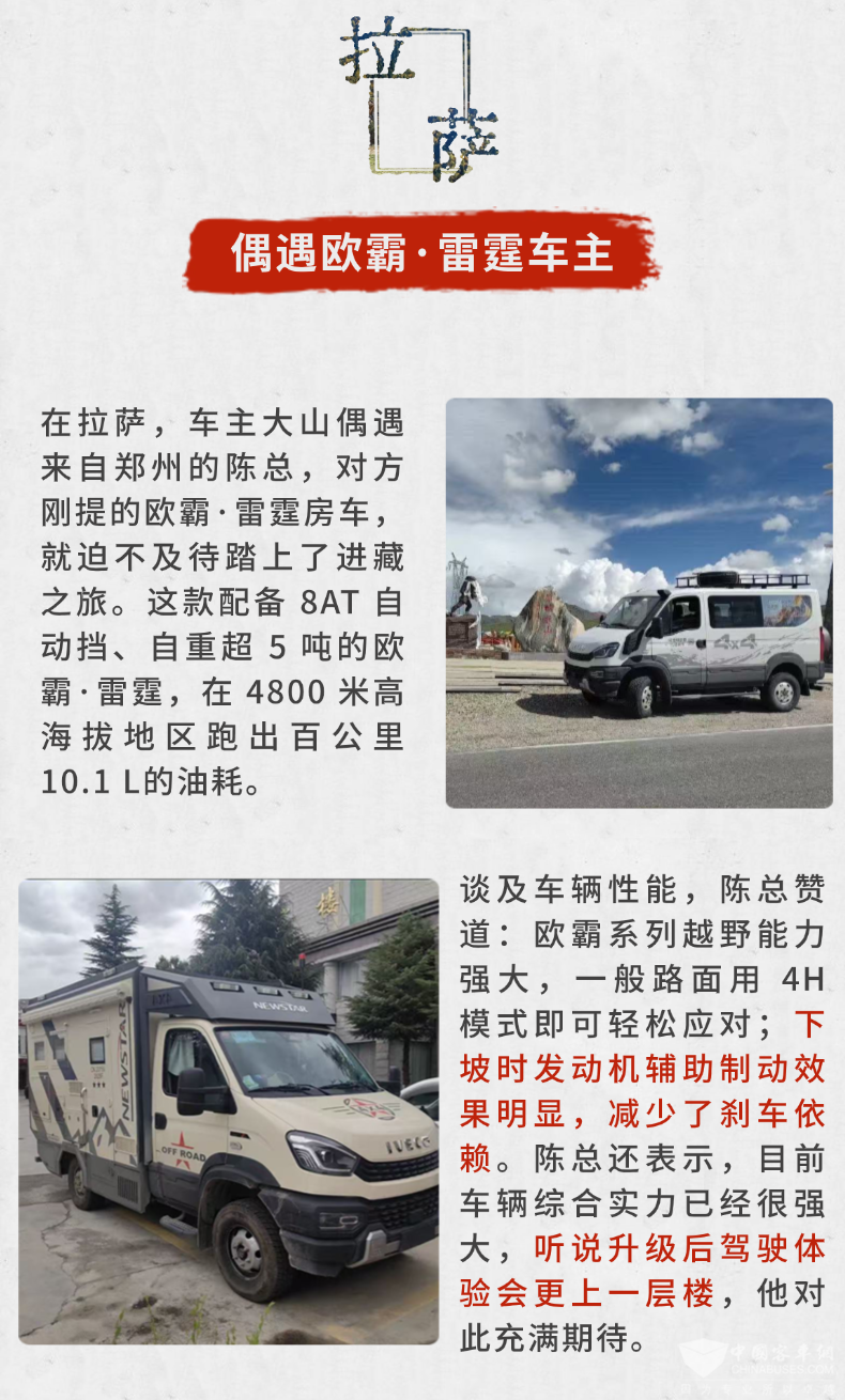 欧霸·雷霆在拉萨旅途中表现优秀,4800米高海拔地区跑出百公里10.1L的油耗,全地形轮胎加持,全时四驱系统搭配三把锁。搭载最新一代F1C高效珀金动力发动机,减少油耗,360全景环视系统清晰呈现周边环境。
