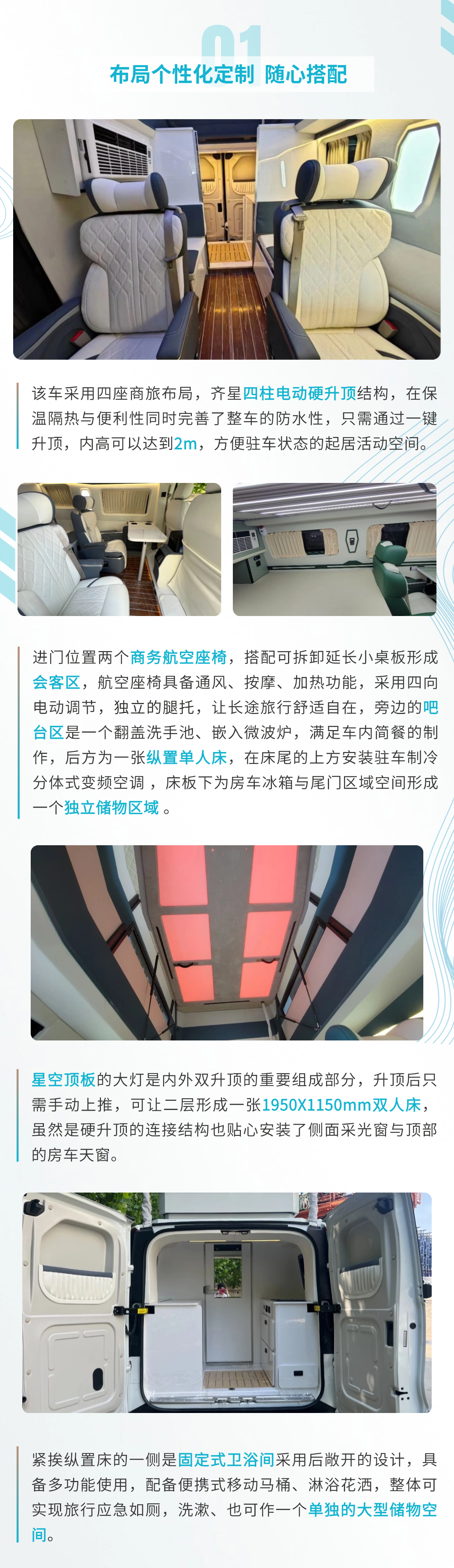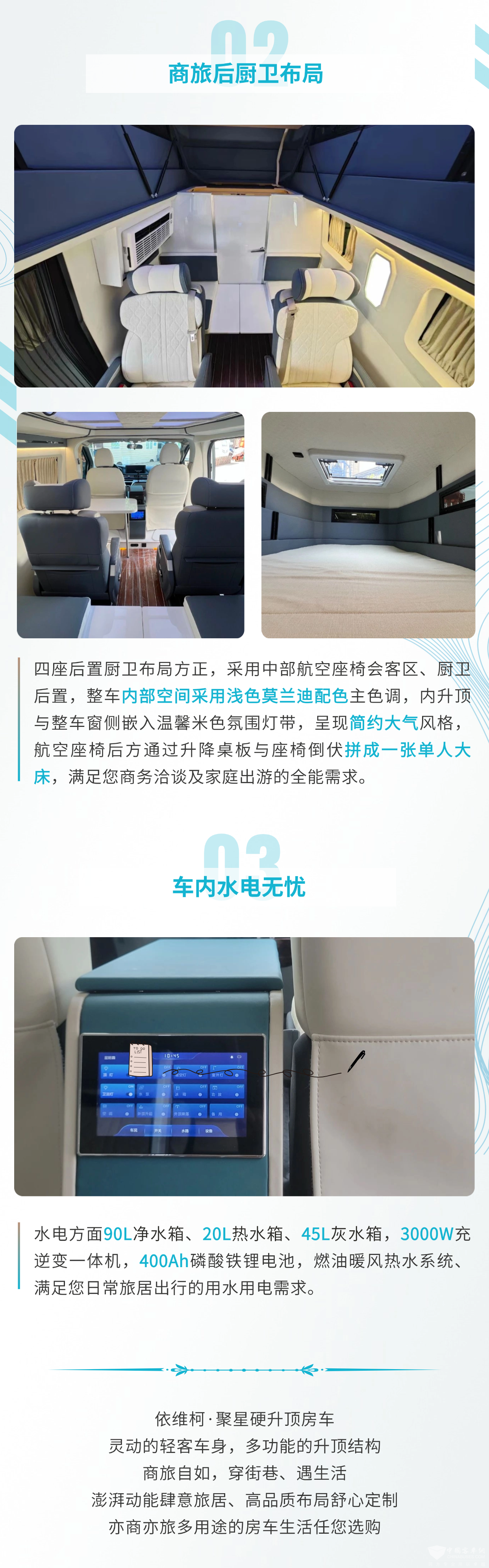 南京依维柯·聚星房车布局个性化定制,可随心搭配,一键升顶后内高可达到2m,配备两个航空座椅和一张单人床,还有固定式卫浴间,整车内部采用浅色莫兰蒂配色,水电配备齐全。