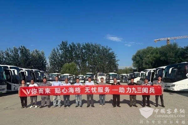 据苏州金龙驻外服务工程师孔祥树介绍,此次承担九三阅兵接驳任务的海格客车共计超260台,所有参与保障的车辆均经过严格筛选,以车队形式分布在北京市多个区域。车型包括海格新V系纯电客车、旅行家氢燃料客车等新能源主力产品,充分体现了绿色低碳的发展理念。