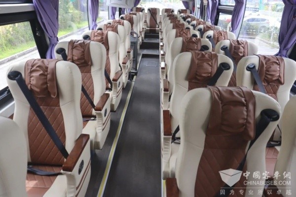 步入车内,豪华而不失温馨的氛围瞬间包围。精选环保材料,打造健康舒适的乘坐环境。整车侧窗采用弧度玻璃,乘客视野更宽阔,旅游观光更舒心。座椅采用高靠背可调豪华商务座椅,带脚踏,使座椅包围性更好,乘客乘坐舒适度高,降低旅途疲劳。座椅采用2+1座椅布局,乘坐空间更大更舒适,为旅客打造静谧、舒适的移动陆地头等舱。