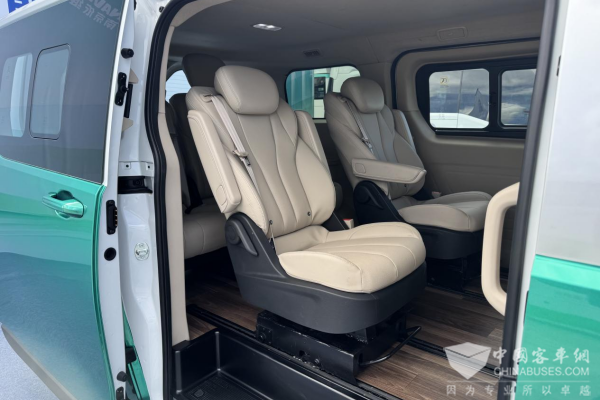 聚星不仅满足当地法规需求,更在续航、空间和舒适性等方面表现卓越。车辆搭载88.8kW·h大容量电池,CLTC工况续航达450km,支持快充30分钟至80%,具备7×24小时连续运营能力,很好地解决了运营商续航焦虑;1.2立方米超大行李舱轻松满足储物需求。独创"魔方空间"设计,二、三排座椅可前后灵活调节,为6名乘员打造远超传统车型的宽敞体验。三区独立空调、丰富的USB/Type-C充电接口和双侧电动移门等贴心配置,全面提升服务品质;10向电动调节驾驶座椅采用人体工学设计,配合EPS电子助力转向、四幅式多功能方向盘和NVH静音工程,有效降低驾乘疲劳,让您倍感舒适。