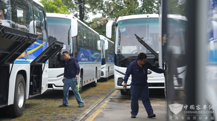 在人员配置上,苏州金龙成立由技术专家、服务工程师组成的全运会服务专项小组,制定精细化服务保障方案;在车辆检查上,专项小组全力配合各客运公司进行一轮又一轮的车辆安全排查——尤其重点针对动力系统、制动系统、安全设施等关键部位进行逐一核验,确保每一台车辆以最佳状态投入赛事服务,同时在赛前全力配合车辆线路演练等各种工作。而在配件供应上,苏州金龙更是提前筹划,针对三电系统、应急的控制器等部件提前存储,确保各类紧急配件供应充足、快速响应提供。
