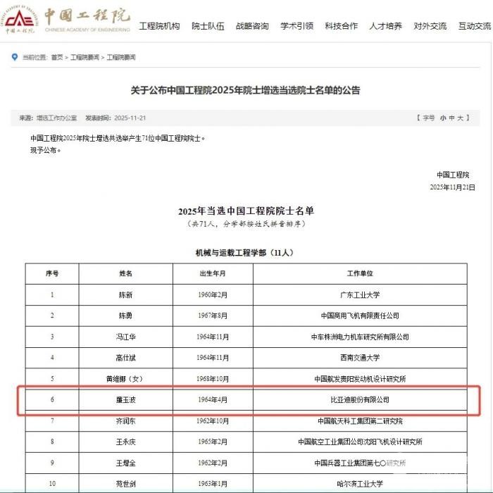 2025年11月21日,中国工程院公布了2025年院士增选结果。比亚迪集团首席科学家、汽车总工程师、汽车工程研究院院长廉玉波当选中国工程院院士。
