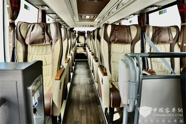 车辆采用商务美学设计,外观时尚大气,流畅的车身线条彰显现代气息。宽体车身设计带来宽敞的内部空间与更优的通过性。车内环境精心打造,配备符合人体工学的豪华座椅、便捷的USB充电接口、独立阅读灯等贴心配置,结合全气囊减震驾驶员座椅、智能座舱管理系统及先进的降噪技术,共同营造出静谧、舒适、愉悦的驾乘空间,让旅途变成一种享受。
