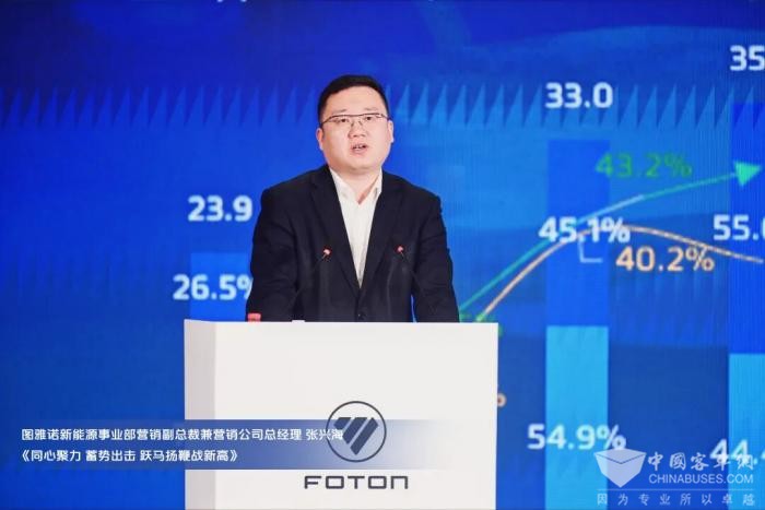 图雅诺新能源事业部营销副总裁张兴海在《同心聚力 蓄势出击 跃马扬鞭战新高》营销报告中,总结2025年战略调整成效,并部署2026年营销举措:推动全系产品焕新,以X5/X7组合攻坚大VAN市场,聚焦7方与明窗车型突破中VAN格局,深挖微卡潜力,精准发力专用车赛道;同步推进网络升级、生态链合与全域传播,全面激发市场动能。