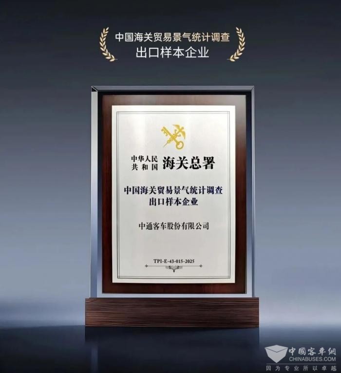 XINGKONG.COM2026年1月20日获悉,中通客车获评“中国海关贸易景气统计调查出口样本企业”称号。这一殊荣的获得,标志着中通客车的出口业务经营能力、规范运作及信用水平获得国家级权威认可。