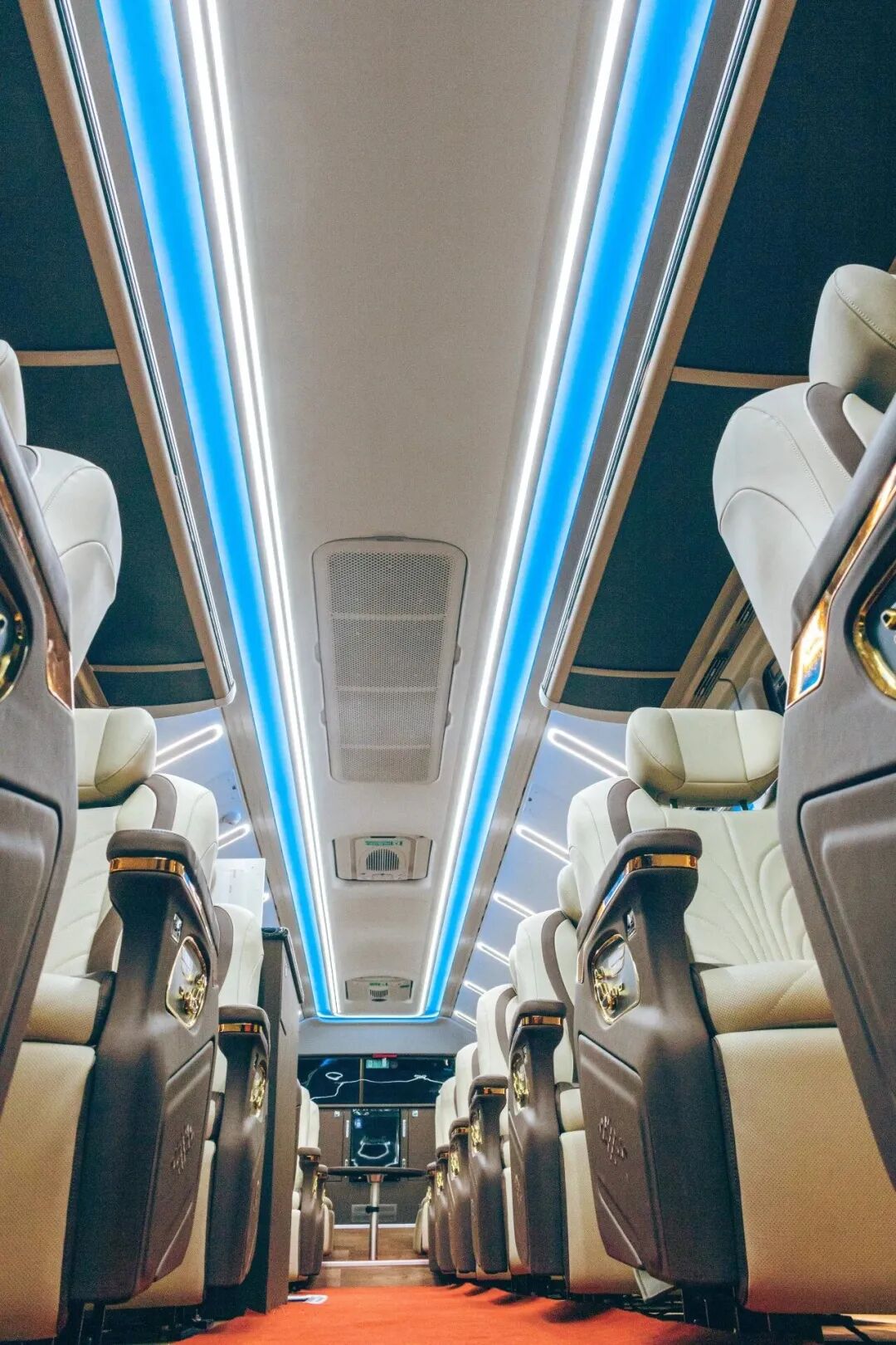 “游龙大巴”基于金龙Merry Combo高端客运车型深度定制开发。整车采用12M超长车身设计,却仅布局16席轻奢座椅,以空间换体验,从源头告别传统旅游大巴高密度座椅带来的局促感。