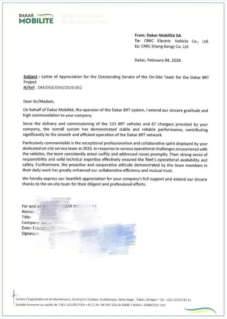 获赞!中车电动收到塞内加尔达喀尔感谢信 运营表现卓越