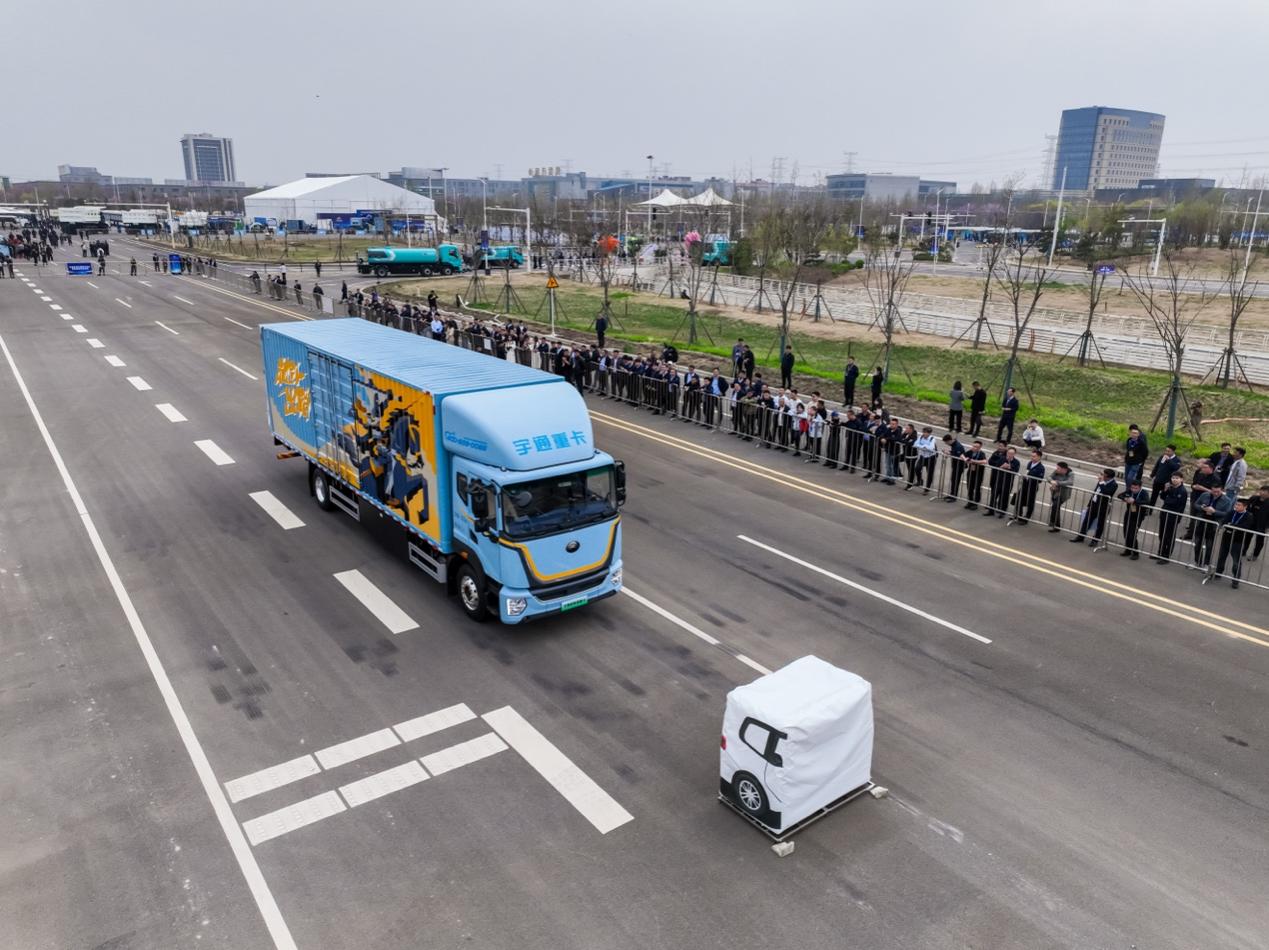 在重卡涉水演示区,车辆驶入深度1.2米的涉水池,从容通过,不用担心电池或线路损坏;随后车辆开展BSD盲区预警,精准识别车辆两侧后方盲区,当存在碰撞风险时,系统会发出预警,必要时主动辅助制动,减少盲区、转弯、开门等各类事故。L4级自动驾驶洗扫车则针对地面落叶、碎石等杂物,精准完成清扫、洗扫、吸尘一体化作业,无需人工干预;矿卡无人驾驶则完成直线行驶、避障、装料、卸料全流程闭环作业。