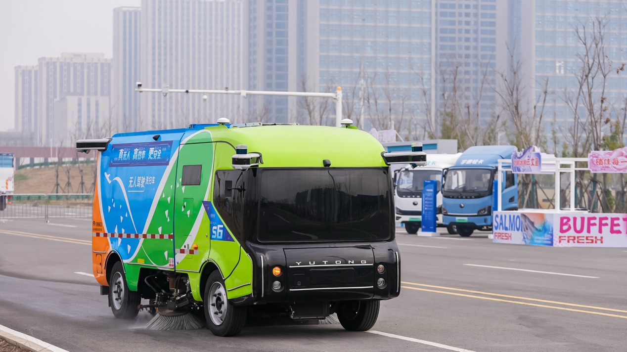 针对作业场景,宇通S6自动驾驶洗扫车在北京、广州等9个城市常态化运营,累计超过100万公里。全新L4级5吨自动驾驶洗扫车,则是行业首个量产商业化产品。纯电矿卡通过1000V高电压平台与BC5高强箱技术,实现更安全、更省电、更抗造;山东邹城凫山砂石矿,全国首个5G+纯电动+自动驾驶标杆项目,安全事故率下降至0。