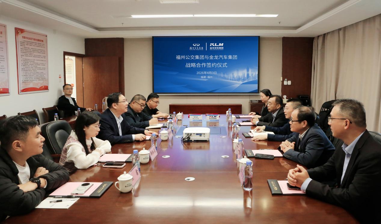 2026年4月3日,厦门金龙汽车集团股份有限公司(以下简称“金龙汽车集团”)与福州市公共交通集团有限责任公司(以下简称“福州公交集团”)在福州举行战略合作签约仪式。双方将在车辆采购与更新、车辆后服务、技术支持、运营保障、资源共享等重点领域展开深度合作。金龙汽车集团销售总监徐向东与福州公交集团企业管理部经理郑如蓝分别代表双方签署协议,金龙汽车集团党委委员、副总裁马祥,福州公交集团党委委员、副总经理黄钦武共同出席并见证了签约。
