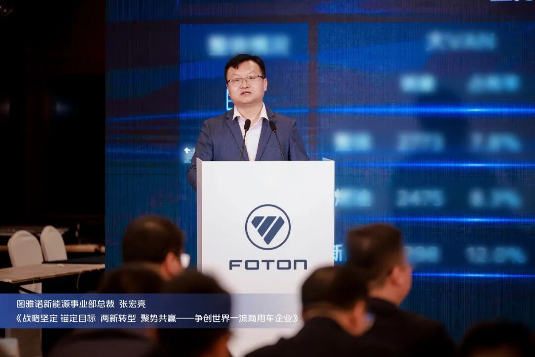在主题报告环节,福田汽车图雅诺新能源事业部总裁张宏亮以《战略坚定 锚定目标 两新转型 聚势共赢——争创世界一流商用车企业》为题,详细阐述了福田图雅诺的发展方向与战略部署。面对新能源轻客市场的关键窗口期,张宏亮强调,福田图雅诺将坚定不移地践行“新能源第一战略”,着眼VAN类市场的巨大增长潜力,立志成为新能源轻客市场的领导者。在“两新转型”的战略框架下,他指出:“新能源”是产业主线,图雅诺将深耕多元细分场景,将用户需求精准转化为产品定义与服务升级的源动力;“新媒体”是营销主线,将着力提升线上获客与圈层运营能力,通过全链条协同驱动高质量增长。