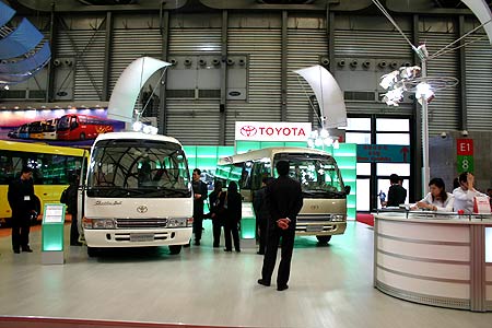 在挤满了众多巨型客车的现场,一汽丰田汽车销售公司的展位却显得非常精致疏朗。本次一汽丰田销售以小博大,力推两款COSTER超级VIP和短程SHUTTLEBUS。前者是高级商务用车及接送贵宾专用车辆,后者则专门针对机场、酒店、旅行社接送客人用的短程BUS,其特色在于后部双开门及前后两个行李舱。