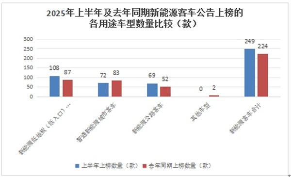 据统计,2025年上半年6个批次的新能源客车公告累计上榜了249款新能源客车新品车型(含231款纯电动客车、9款燃料电池客车和9款插电式混动客车),比去年同期的224款增长11%。