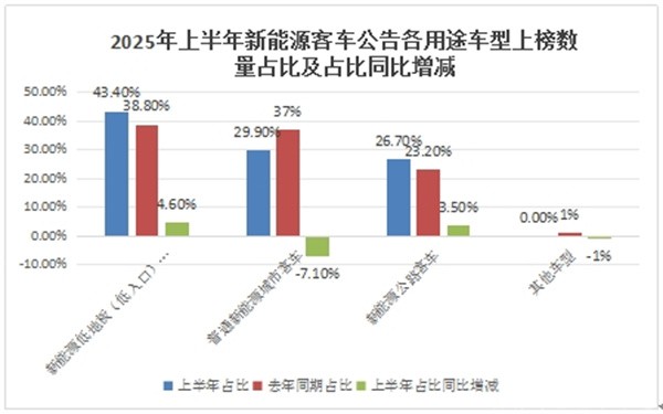 2、按目标用途划分,2025年上半年各类纯电动客车车型(含纯电动、燃料电池和插电式混动车型)上榜数量占比及占比同比增减(数据来源:工信部)