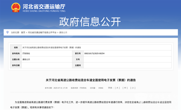 2025年7月31日,河北省交通运输厅、河北省财政厅和河北省税务局印发通知,自2025年10月1日起,河北全省高速公路收费站混合车道全面使用电子发票(票据),车道通行现场不再提供通行费纸质发票(票据)。