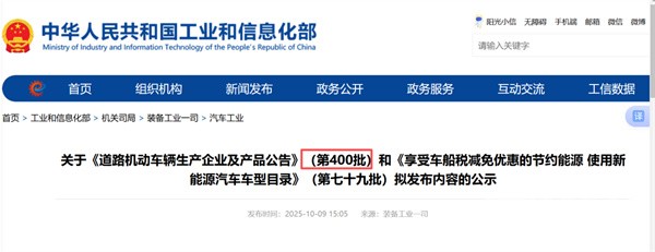 2025年10月10日,工信部发布关于《道路机动车辆生产企业及产品公告》(第400批公告,下也称”本批次公告”),这是2025年以来工信部发布的第10个批次的新车产品公告,也是2025年下半年的第4批公告。