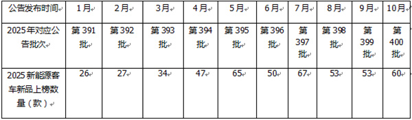 表2,根据工信部数据,2025年1-10月,各批次新能源客车公告中上榜的新能源客车数量统计: