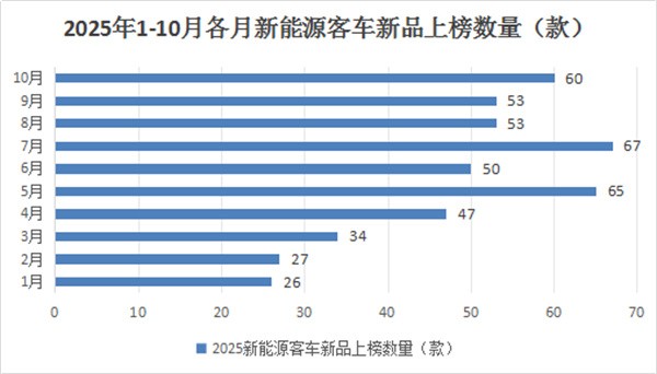 上图表显示,2025年10月工信部发布的第400批公告中,上榜新能源客车新品53款,居今年以来各月第三,这或许意味着为了迎接“银十”客车市场旺季的到来,车企在新能源客车产品布局力度方面仍然不小。因为只有有竞争力的新产品才是拓展市场、赢得客户的最好的筹码。