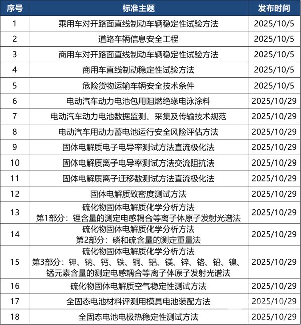 2025年10月共有定稿发布标准18部,其中大部分于电池标准相关,对纯电动客车动力系统规范有重要意义。详情如下: