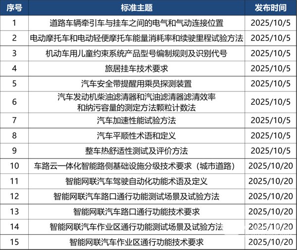 2025年10月共有新立项标准15部,涉及智能网联、车辆测试、零部件等。