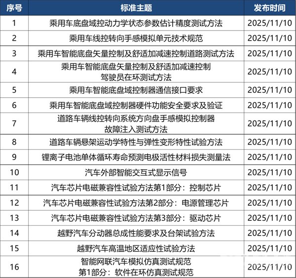 2025年11月共有定稿发布标准16部,涉及底盘、芯片、电池等方面。详情如下: