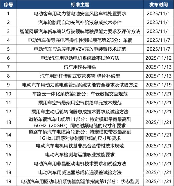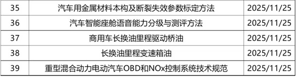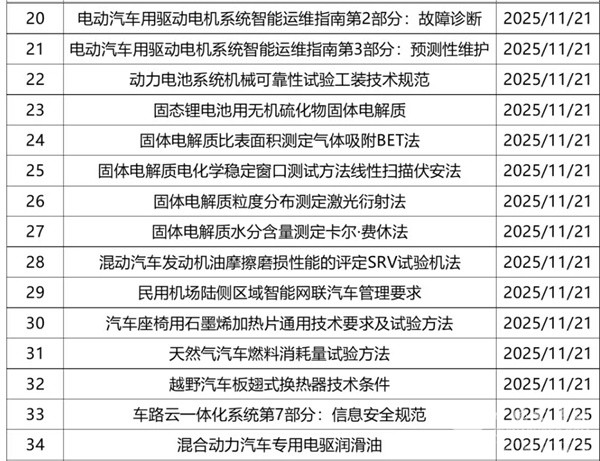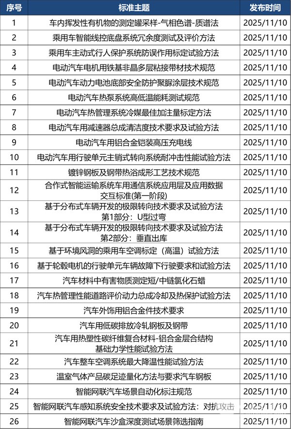 2025年11月共有新立项标准26部,涉及智能网联、车辆测试、零部件等。详情如下:
