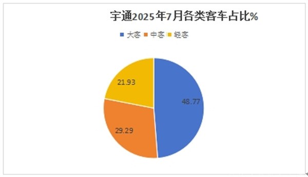 大中型客车依然是主体部分。今年7月份,宇通大型客车销量占比为48.77%,相对之前几个月均超50%的份额有所缩小,也是近几个月来首次份额没有过半的月份;中型客车销量占比为29.29%,居第二;轻型客车销量占比为21.93%,居第三,是近几个月来首次占比超2成的月份。