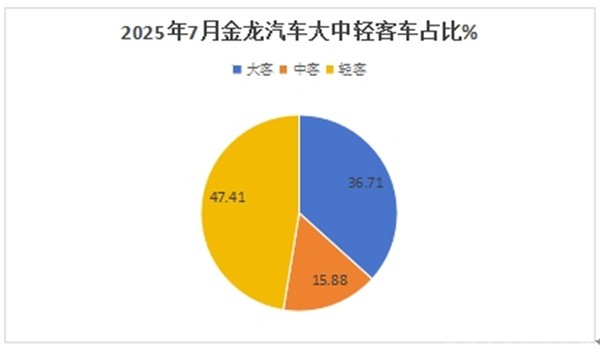 ---从产品销售结构来看,2025年7月份,金龙汽车轻型客车销量最多(占比47.41%)领跑,成为2025年7月金龙汽车市场的主体部分;大型客车销量占比36.71%居第二,中型客车占比15.88%,居最小;