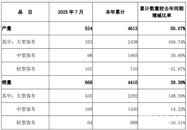 近日,中通客车发布了2025年7月份及1-7月产销数据快报。