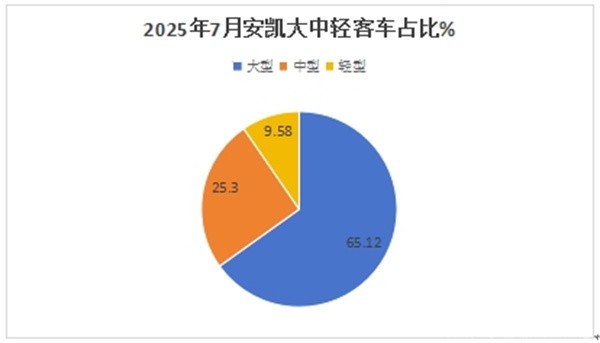 ---从产品销售结构来看,2025年7月份,安凯大型客车销量最多(占比65.12%),成为2025年7月安凯客车市场的绝对主体部分;中型客车销量占比25.30%居第二;轻型客车占比9.58%,居最少;