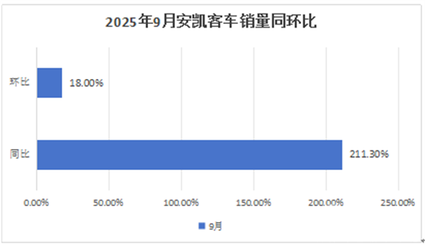 上图显示,安凯客车2025年9月6米以上客车销量同比暴增241.25%,领涨行业前10车企,表现特别抢眼。据分析主要原因有以下几个方面: