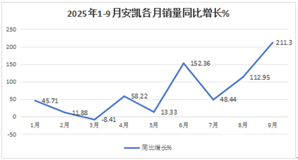 上图表可见,2025年9月安凯客车销量909辆,销量居2025年1-9月第二(第一是6月的964辆);同比增长211.3%,增速创下2025年1-9月各月同比增速最高!