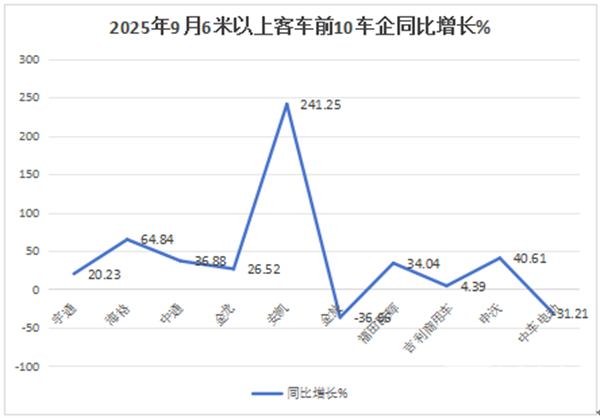 根据中国客车统计信息网数据,2025年9月6米以上大中型客车前10车企销量同比增速统计如下: