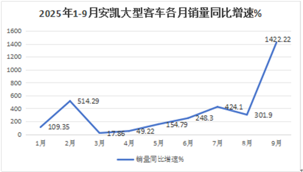 上图表可见,2025年9月安凯大型客车销量548辆,居2025年1-9月第二(第一高是6月的613辆),其同比增速暴涨1422.22%,创下2025年前9月各月最高,说明今年9月安凯大型客车市场发力最猛,为2025年9月安凯客车整体销量的增长提供了强力的支持。