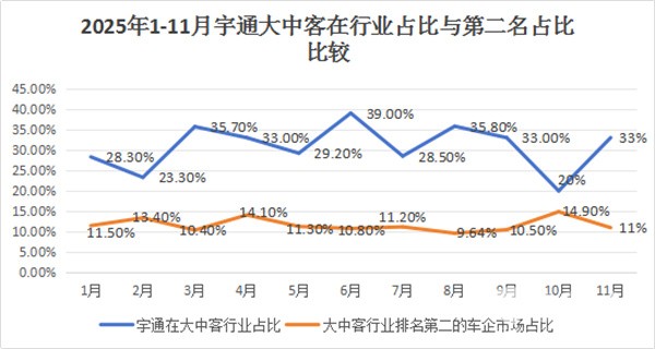 上图表可见,2025年1-11月,宇通在我国大中型客车行业的市场占比大部分月份都在3成以上,甚至接近4成,其中11月占据行业的份额也超3成。且年内各月一直都排行第一;