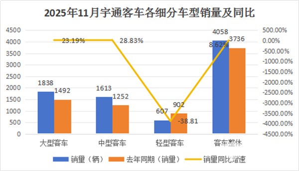 根据宇通产销快报,2025年11月宇通客车各细分车型销量同比增速与其整体同比增速比较: