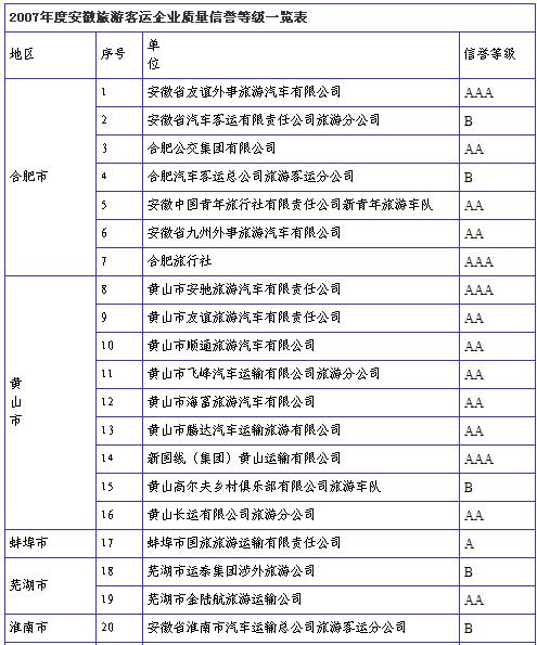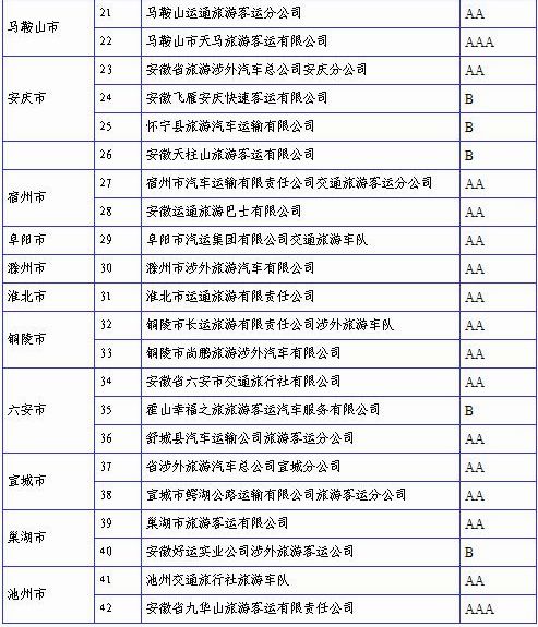 近日,经安徽省交通厅运管局认证,安徽省42家旅游客运企业质量信誉考核结果公布。
