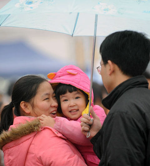 1月20日,重庆汽车站露天候车点,一家三口正在小雨中等待回家的客车